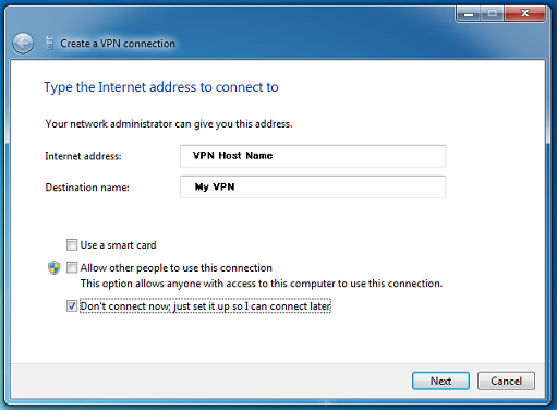 Lastly, make sure that the checkbox labelled “Don’t connect now; just set it up so I can connect later” is checked.