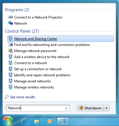 Click on the Start Menu, type the word “Network” into the search box, and click on “Network and Sharing Center”.