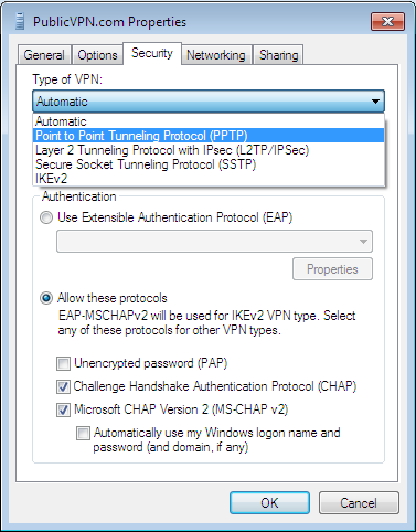 When the property window opens, click on the “Security” tab. Click on “Automatic”, and change it to “Point to Point Tunnelling Protocol (PPTP).